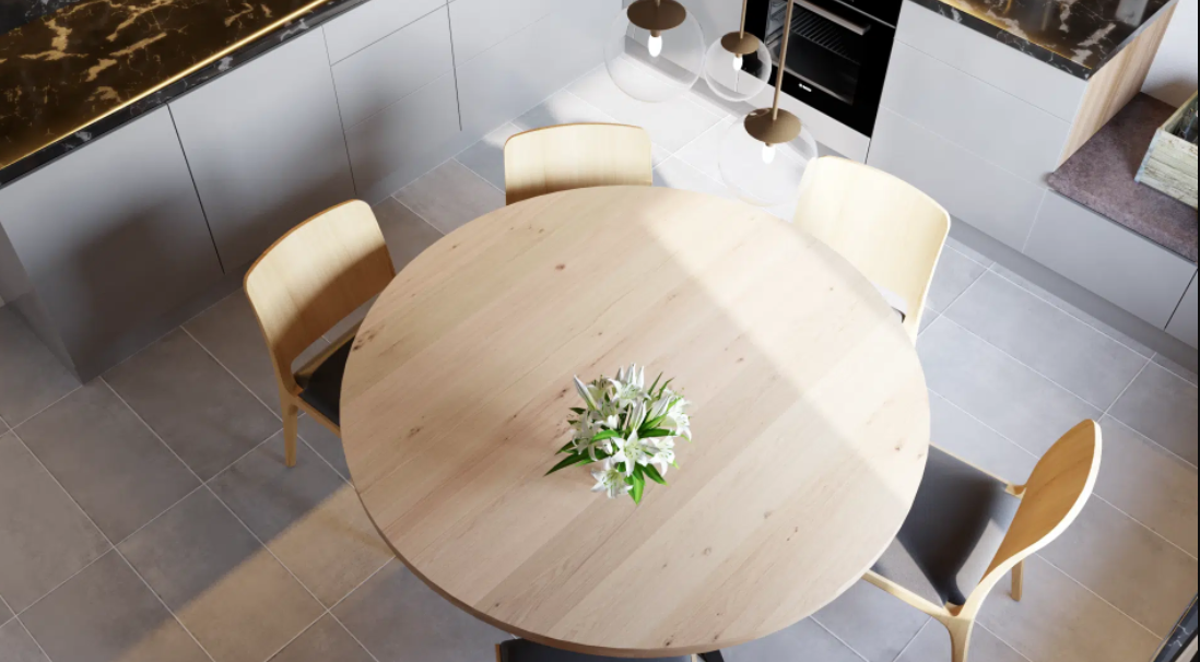 میز ناهارخوری گرد حالتی صمیمیتر به آشپزخانه میدهد. کسانی که دور این میز برای صرف غذا مینشینند هم این صمیمیت را احساس میکنند. این میزها نه فقط برای غذای خوردن بلکه برای صحبت کردن با اعضای خانواده و بازی کردن هم قابل استفاده هستند و به خاطر گرد بودن و نزدیک کردن افراد به یکدیگر ارتباط برقرار کردن را آسانتر میکنند.
